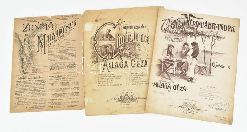 cca 1900-1910 3 db régi kotta: Zenélő Magyarország zenemű folyóirat VII. évf. 13. füzet; Allaga Géza: Válogatott népdalok cimbalomra; Magyar népdalábrándok cimbalomra. Változó állapotban.