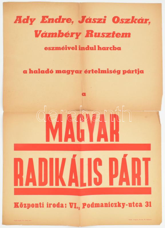 https://www.darabanth.com/en/454-Online-auction/454.0/Art-and-other-collectibles/Posters~1500013/1945-Magyar-Radikalis-Part-Ady-Vambery-valasztasi-plakat-serult-szakadassal-46x60-cm~II3030198