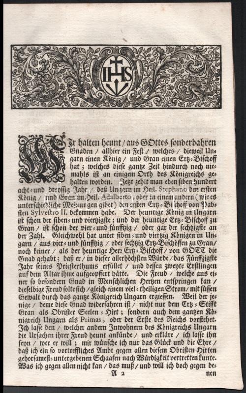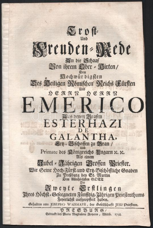 1738 Waismayr, Joseph (1688-1751): Trost- und Freuden-Rede an die Schaaf von ihrem Ober-Hirten dem [...] Herrn Emerico aus denen Grafen Esterhazi de Galantha, Erz-Bischoffen zu Gran und Primate des Königreichs Ungarn [...] Pressburg [Pozsony], 1738, Maria Magdalena Royerin, 13 sztl. lev. Német nyelven. JavÃtott gerinccel.