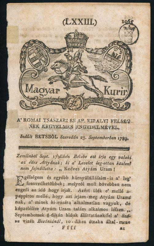 1789 Magyar Kurir LXXIII. sz., "Indúlt Bétsből Szeredán 23. Szept... https://www.darabanth.com/en/454-Online-auction/454.0/Art-and-other-collectibles/Printed-Materials~1500012/1789-Magyar-Kurir-LXXIII-sz-Indult-Betsbol-Szeredan-23-Szeptemberben-1789-a-cimlapon-Ma~II3030181