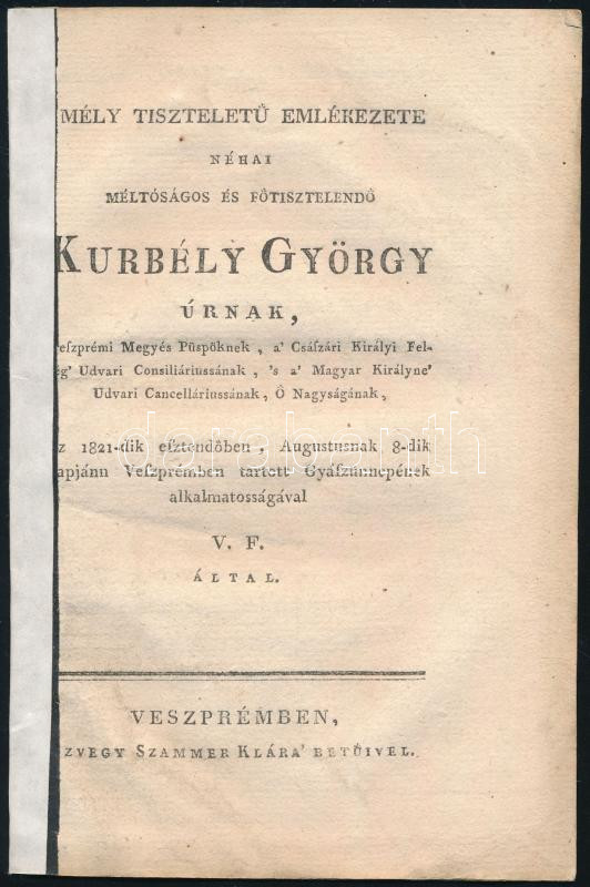 1821 Mély tiszteletű emlékezete néhai méltóságos és főtisztelendő Kurbély György úrnak, Veszprémi Megyés Püspöknek, [...] az 1821-dik esztendőben, Augustusnak 8-dik napjánn Veszprémben tartott Gyászünnepének alkalmatosságával V. F. által. Veszprém, [1821], özv. Szammer Klára, 4 sztl. lev. Javított gerinccel.