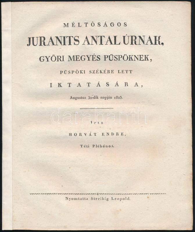 1825 Horvát Endre: Méltóságos Juranits Antal úrnak, győri megyés püspö... https://www.darabanth.com/en/454-Online-auction/454.0/Art-and-other-collectibles/Printed-Materials~1500012/1825-Horvat-Endre-Meltosagos-Juranits-Antal-urnak-gyori-megyes-puspoknek-puspoki-szek~II3025052