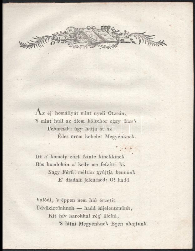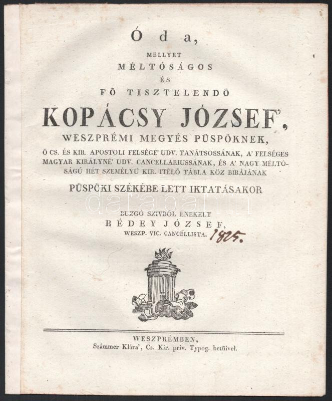 1825 Rédey József: Óda, mellyet méltóságos és fő tisztelendő Kopácsy József', weszprémi megyés püspöknek, ő cs. és kir. apostoli felsége' udv. tanátsossának, a' felséges magyar királyné' udv. cancellariussának, és a' nagy méltóságú hét személyü kir. itélő tábla köz birájának püspöki székébe lett iktatásakor buzgó szivből énekelt - - , weszp. vic. cancellista. Veszprém, [1825], Számmer Klára', Cs. Kir. priv. Typog., 4 sztl. lev. Javított gerinccel.