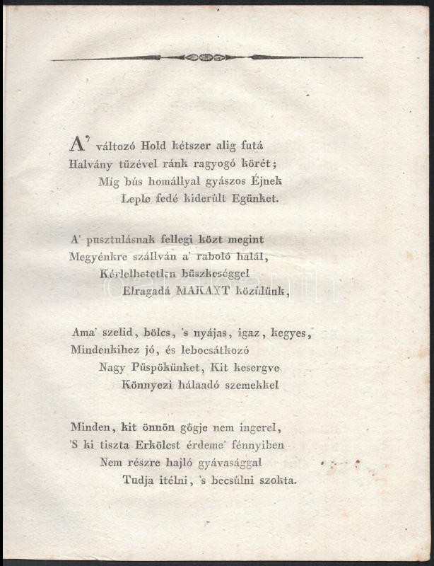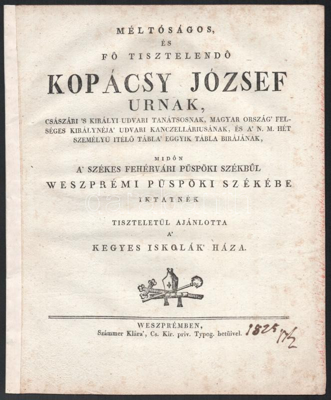 1827 Tóth Lajos: Méltóságos, És Fő Tisztelendő Kopácsy József Urnak, Császári 'S Királyi Udvari Tanátsosnak, [...] Midőn A' Székes Fehérvári Püspöki Székbűl Weszprémi Püspöki Székébe Iktatnék, Tiszteletül Ajánlotta A' Kegyes Iskolák Háza. Veszprém, [1827], Számmer Klára', Cs. Kir. priv. Typog., 4 sztl. lev. Javított gerinccel, minimálisan foltos.