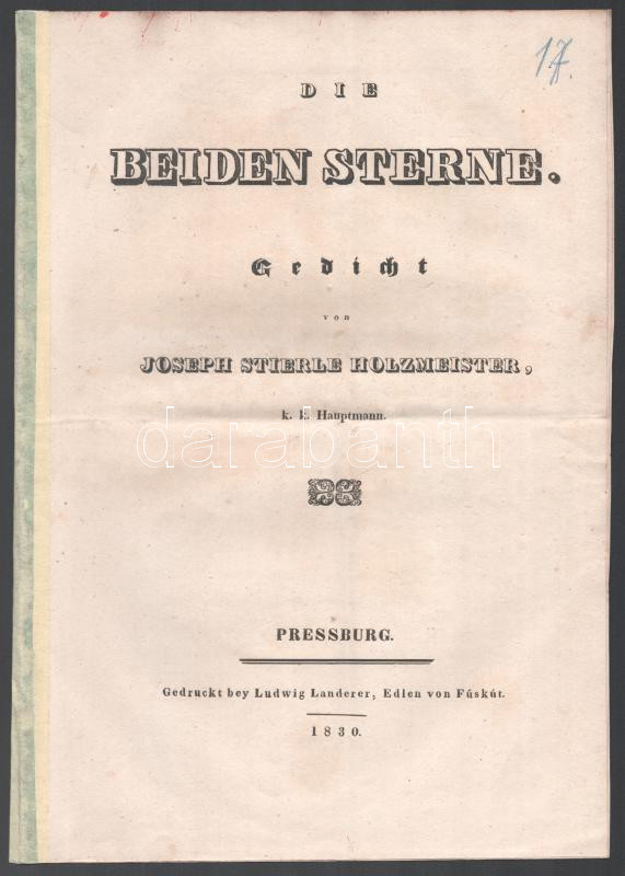 1830 Die beiden Sterne. Gedicht von Joseph Stierle Holzmeister, k. k. ... https://www.darabanth.com/en/454-Online-auction/454.0/Art-and-other-collectibles/Printed-Materials~1500012/1830-Die-beiden-Sterne-Gedicht-von-Joseph-Stierle-Holzmeister-k-k-Hauptmann-Pozsony-1830-Land~II2923136
