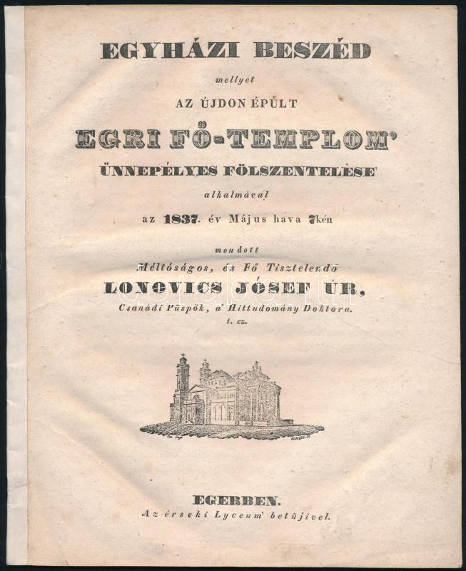 1837 Lonovics József (1793-1867): Egyházi beszéd, mellyet az újdon épűlt egri fő-templom' ünnepélyes fölszentelése' alkalmával az 1837. év Május hava 7-kén mondott Méltóságos, és Fő Tisztelendő - - Úr, Csanádi Püspök, a' Hittudomány Doktora. Eger, [1837], Érseki Lyceum-ny., 24 p. Javított gerinccel, kissé foltos.