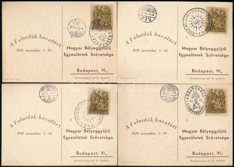 1938 4 db levelezőlap Felvidék visszatért bélyegzésekkel, különböző vá...