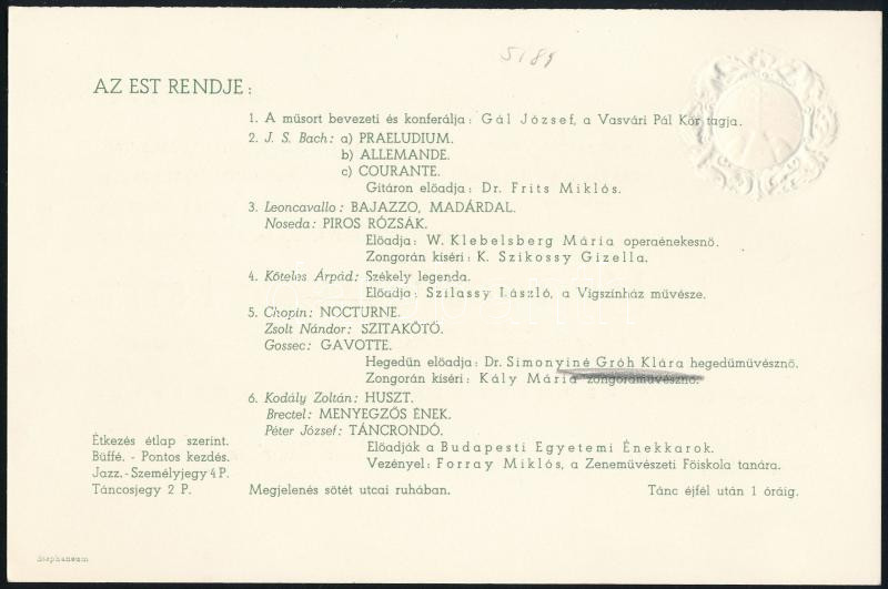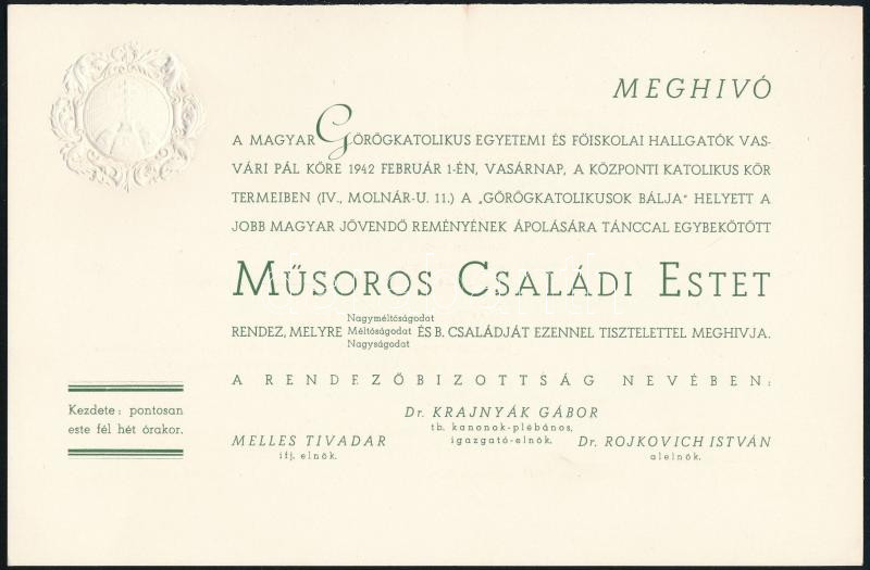 Description: 1942 Meghívó a Magyar Görögkatolikus Egyetemi és Főiskolai Hallgatók Vasvári Pál Köre által rendezett műsoros családi estre, díszes dombornyomott címerrel, jó állapotban, 20x13 cm
