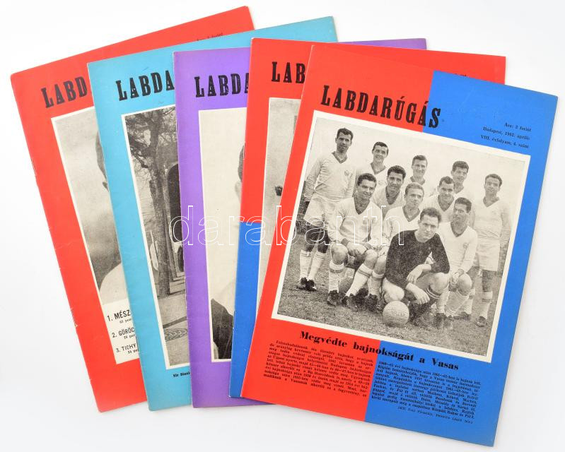 1962 Labdarúgás c. folyóirat 5 db száma: VIII. évf. 4., 7., 10., 11., 12. sz., 1962. április-december. Fekete-fehér fotókkal a cÃmlapokon a Vasas bajnokcsapata, Mészöly Kálmán, stb. Kiadói tűzött papÃrkötés, nagyrészt jó állapotban.