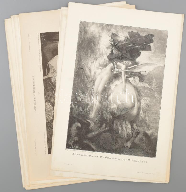 2 lapos nyomatok, 32 db fametszet, Moderne Kunst, Illustrierte Schreitschrift, Verlag von Rich. Bong in Berlin, ill. Moderne Kunst in Meisternholzschnitten a legkülönbözőbb témákban, köztük erotikusak is, történelem, vadászat, kivégzés, életképek, idill, szerelmesek, Mazeppa, V. Károly halála, apácák, Madonna, stb.