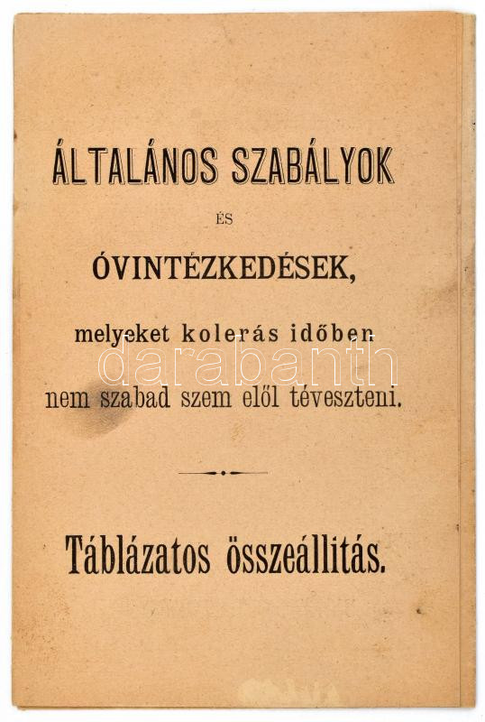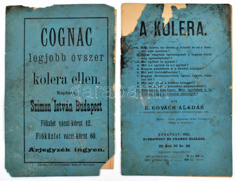 cca 1892 2 db kolera elleni tájékoztató: E. Kovách Aladár: A kolera. Bp., 1892, Dobrowsky és Franke, 16 p. Kiadói tűzött papírkötés, sérült, a hátsó borító levált. + Általános szabályok és óvintézkedések, melyeket kolerás időben nem szabad szem elől téveszteni. Táblázatos összeállítás. Kisebb szakadással, kihajtva: 34x33,5 cm