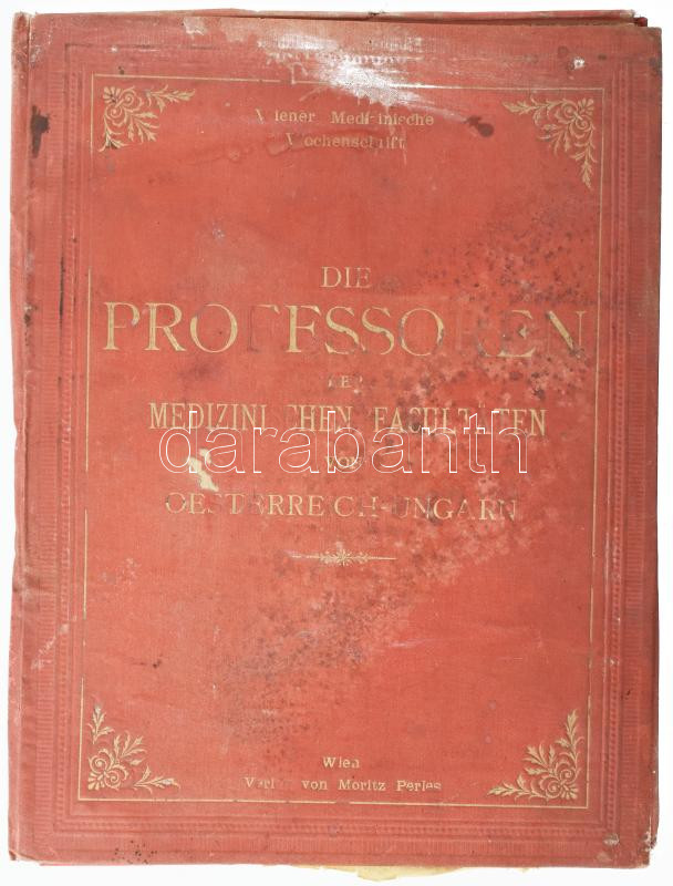 Description: cca 1896 Die Professoren der medicinischen Facultäten von Oesterreich-Ungarn 15 db képes táblát tartalmazó mappa, a lapok alján 1892-1896 dátumozásokkal. Aranyozott egészvászon kötés, foltos Wien, Moritz Péries. 24x34 cm