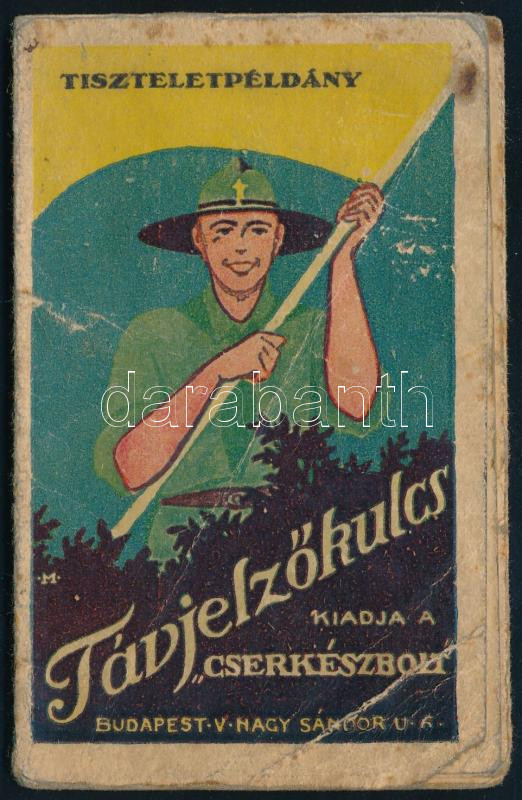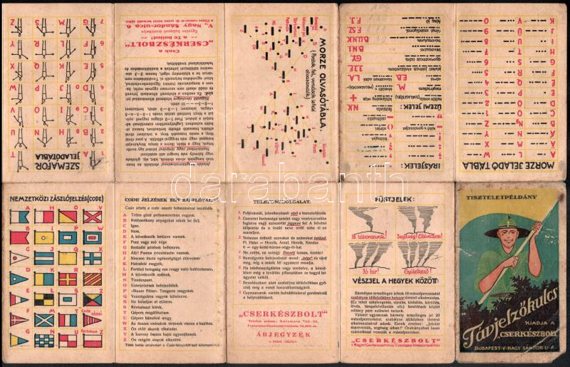 - cca 1931 Távjelzőkulcs, kiadja a ,,Cserkészbolt". Tiszteletpéldány. Morze-, szemafor- és füstjelek, nemzetközi zászlójelzések ismertetője, kihajtható, hátoldalán a Cserkészbolt árjegyzékével. Bp., "Élet"-ny., kihajtva: 45x24 cm használt