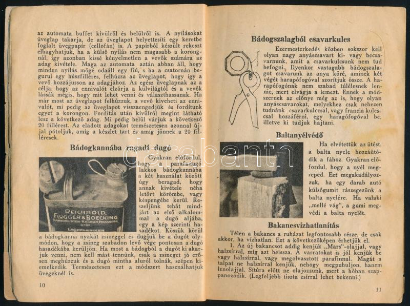 Bereznai Aurél - Harsány György: A Magyar Cserkész ezermester könyve. Bp., 1937, Magyar Cserkész (Tolnai-ny.), 128 p. Fekete-fehér képekkel illusztrálva. Kiadói papírkötés, sérült, foltos borítóval, helyenként foltos lapokkal.