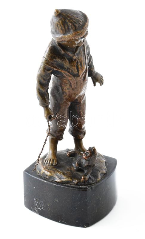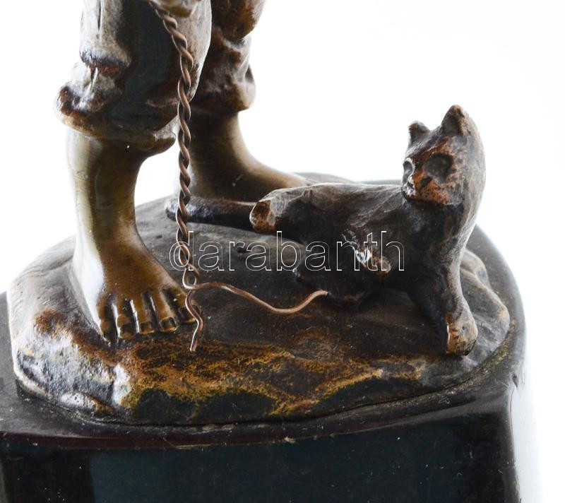 Julius Schmidt-Felling (1835-1920): Fiú macskával. Öntött patinázott bronz, jelzett, márvány talapzaton. Talapzaton kopással, m: 13 cm.
