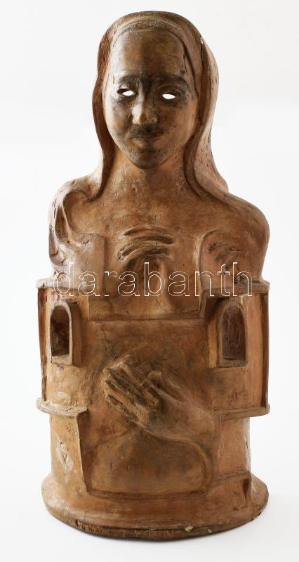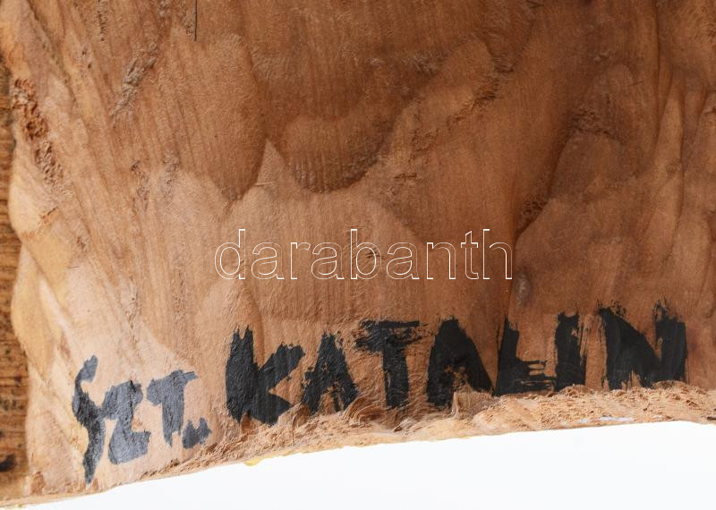 Katona Zsuzsa (1951-): Sziénai Szent Katalin. 2001, faragott fa. Jelzett, m: 39,5 cm /// Munkácsy-díjas szobrászművész. Fából vagy kőből faragott, ritkábban mintázott, bronzból öntött, általában homloknézetre komponált, idolszerű, időtlenséget sugárzó figurákat alkot, amelyeknek teste sokszor üreges, kéregszerű. Szobrainak felületén kozmikus utalásokat hordozó ráfestések, karcolások jelennek meg."