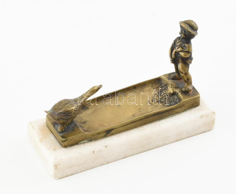 Komisz kisfiú. Bronz szobor. Mészkó talapzaton. Jelzés nélkül. Fiú egyik lábánál a rögzítés elvált 18x11 cm