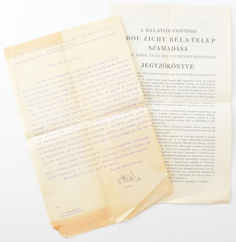 1921 Balaton-Fonyód- gr Zichy Bélatelep ig. jelentése, 1920-21 és Ripka Ferenc levél