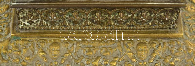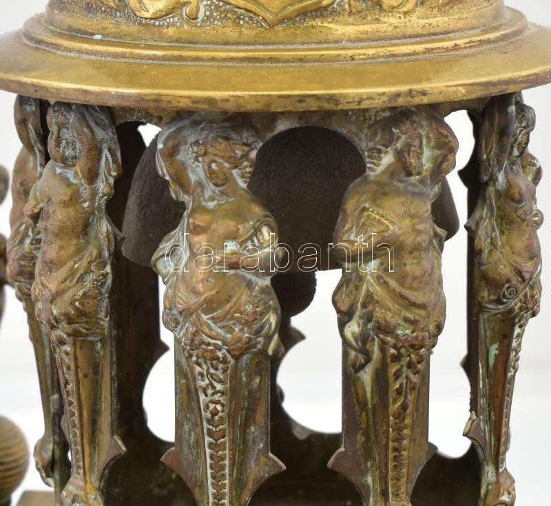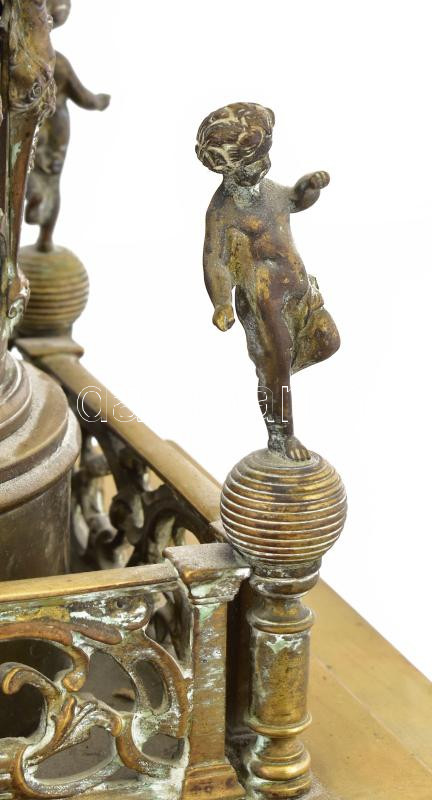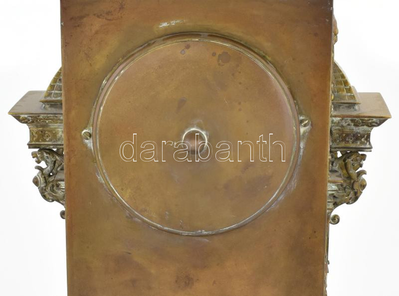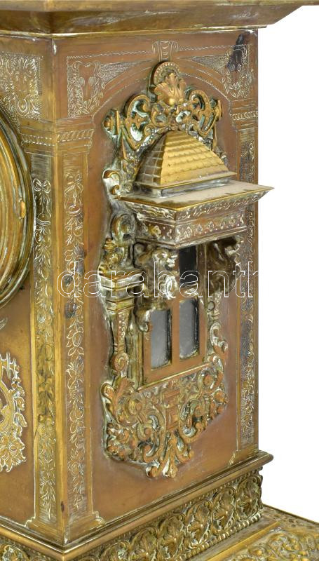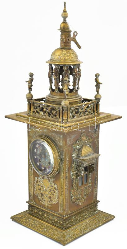 Francia gyarmatok (feltehetően) vagy Franciaország, XX. sz. első fele, Nagyméretű réz torony formájú asztali óra. Gazdag trébelt, arcokat is magába foglaló díszítésű talapzatán torony formájú óratest, egyik oldalán vésett és trébelt mintákkal körülölelve helyezkedik el a zománcozott díszítésű számlap, mellette lévő két oldalán neorokokó jellegű plasztikus díszítésben üvegezett ablakok. Tetején rokályokból felépülő kerítésrészek, puttó és csúcsdíszt tartó női figurák, a kupoladísz alatt csengővel. Lábai hiányoznak. Kopással, némi deformálódással, kulcsa megvan. M: 62 cm
