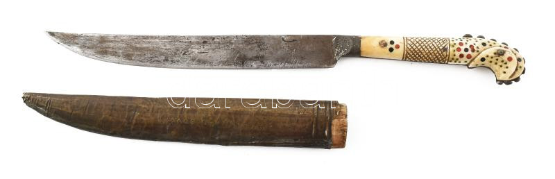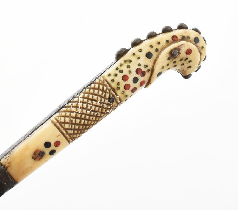 Choora, afgán tőr, XIX. sz., berakásos csont markolattal, sérült bambusz hüvellyel, h: 30 cm / Choora, Afghan dagger, 19th century, with an inlaid bone handle and a damaged bamboo scabbard, length: 30 cm.
