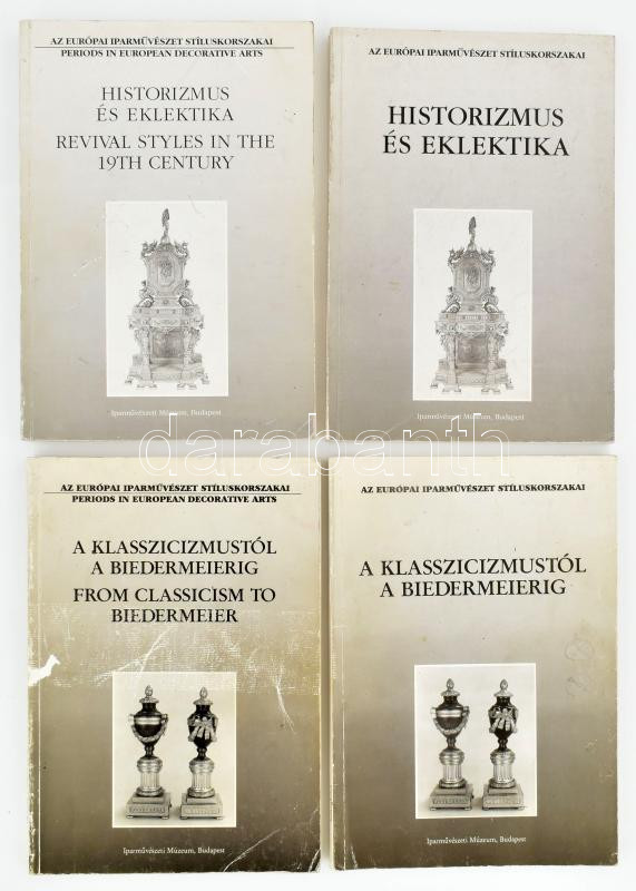 4 db kötet az európai parművészet stÃluskorszakai katalógus sorozatból: Péter Márta (szerk.): A klasszicizmustól a biedermeierig I-II. Bp., 1990, Iparművészeti Múzeum. Kiadói papÃrkötés, I. kötet borÃtóján apró tollas firkával, II. kötet borÃtóján apró felületi sérülésekkel, néhány oldalon ceruzás jegyzetekkel. + Péter Márta (szerk.): Historizmus és eklektika I-II. Bp., 1992, Iparművészeti Múzeum. Kiadói papÃrkötés, borÃtókon apró kopásnyomokkal.