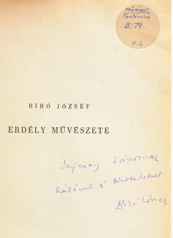 Biró József: Erdély művészete. Lyka Károly előszavával. Erdélyi Írások. (DEDIKÁLT). Bp., [1941], Singer és Wolfner, 304 p. Első kiadás. A 188. és 285. oldalak között egészoldalas, fekete-fehér fotókkal. Kiadói papírkötés, sérült, a hátsó borító levált, részben laza fűzéssel. A szerző, Biró (Bíró) József (1907-1945) művészettörténész, a nyilasterror áldozata által Jajczay János (1892-1976) művészettörténész részére DEDIKÁLT példány.