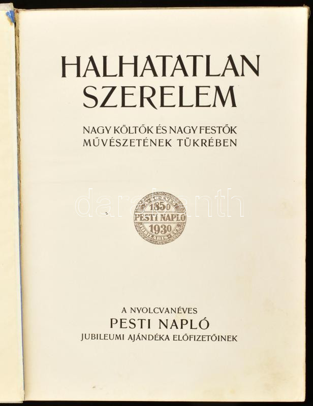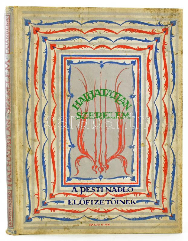 Halhatatlan szerelem. Nagy költők és nagy festők művészetének tükrében. Szerk.: Dr. Mikes Lajos. A nyolcvanéves Pesti Napló ajándéka előfizetőinek. Bp., 1930, Pesti Napló. Gazdag fekete-fehér és színes képanyaggal, könyvdíszekkel illusztrálva. A borító illusztrációja Falus Elek munkája. Kiadói egészvászon-kötés, kissé foltos, koszos borítóval, helyenként kissé foltos lapokkal.