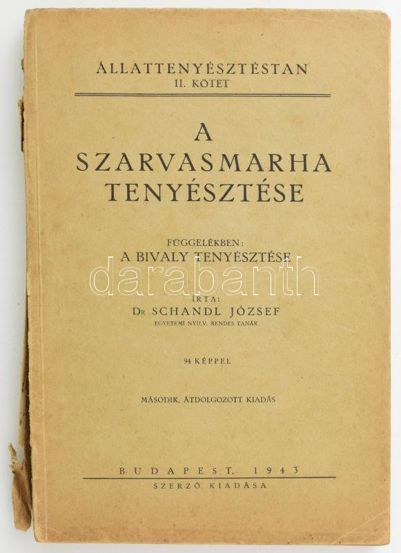 Schandl József: A szarvasmarha tenyésztése. Függelékben: A bivaly tenyészetese II. köt. Bp., 1943.,SzerzÅ‘i. Második, átdogozott kiadás. Szövegközti fekete-fehér illusztrációkkal. Kiadói papÃrkötés, sérült, részben hiányos gerinccel, de belül jó állapotban.