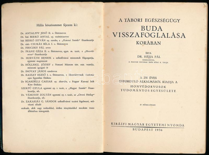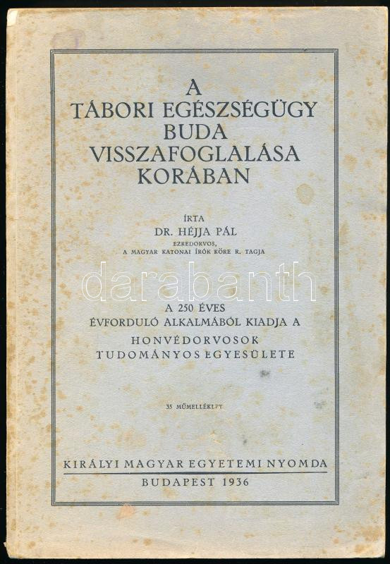 Description: Héjja Pál: A tábori egészségügy Buda visszafoglalása korában. A 250 éves évforduló alkalmából kiadja a Honvédorvosok Tudományos Egyesülete. 35 műmelléklettel. Bp., 1936, Kir. M. Egyetemi Nyomda, 225+1 p. Kiadói papírkötés, foltos borítóval.