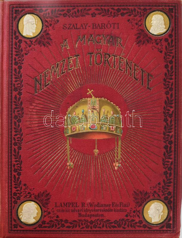 Szalay József - Baróti Lajos: A magyar nemzet története. I-IV. kötet. [Teljes]. Bp., [1896-1897], Lampel Róbert (Wodianer F. és Fiai). Rengeteg szövegközi és egészoldalas illusztrációval, térképekkel, kihajtható mellékletekkel. Kiadói aranyozott, festett, dombornyomott egészvászon-kötés, a borítókon némi kopással, kisebb sérülésekkel, foltokkal, belül nagyrészt jó állapotban, helyenként kissé foltos lapokkal.