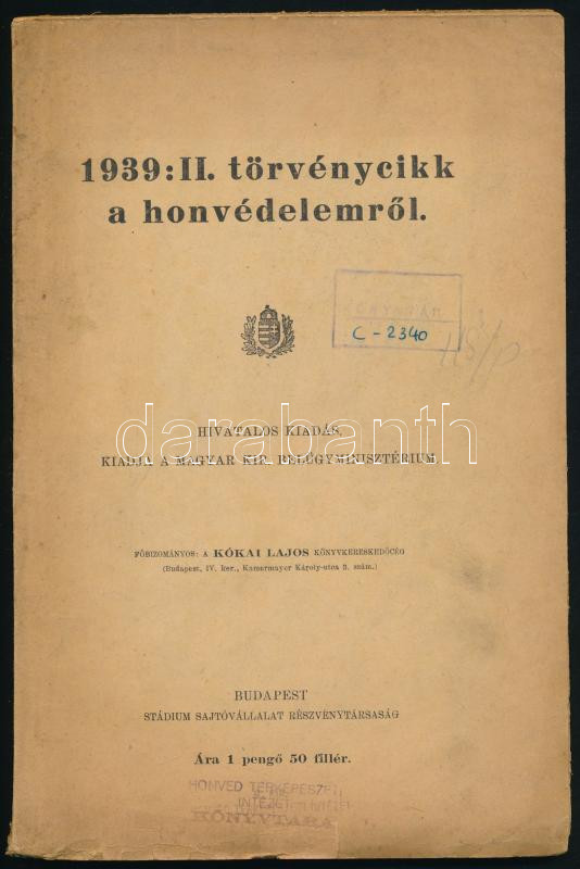 1939: II. törvénycikk a honvédelemről. Bp., én., M. Kir. Belügyminiszt... https://www.darabanth.com/en/454-Online-auction/454.0/Books/Books-Military~1500019/1939-II-torvenycikk-a-honvedelemrol-Bp-en-M-Kir-Belugyminiszterium-Stadium-ny-Ki~II3030681
