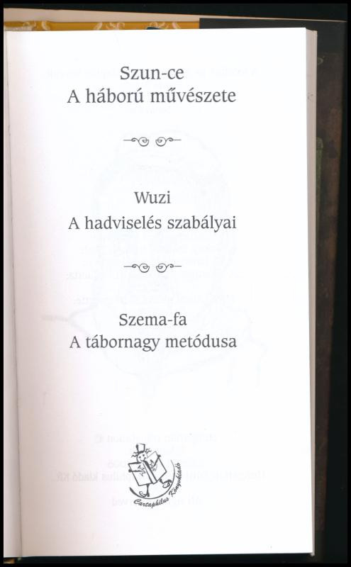 Szun-ce: A háború művészete; Wuzi: A hadviselés szabályai; Szema-fa: A tábornagy metódusa. (Egy kötetben). Ford.: Tokaji Zsolt, Szántai Zsolt. Bp., 2006, Cartaphilus. Kiadói kartonált papÃrkötés, kiadói papÃr védÅ‘borÃtóban, jó állapotban.