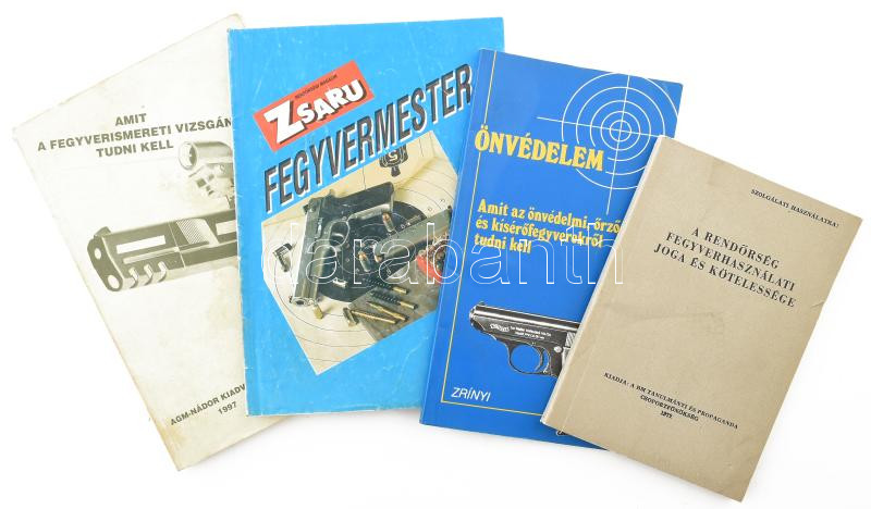 Vegyes fegyverhasználattal kapcsolatos tétel, 4 db: A rendőrség fegyverhasználati joga és kötelessége. "Szolgálati Használatra." Bp., 1972., BM Tanulmányi és Propaganda Csoportfőnökség. Kiadói papírkötés.; Balogh István - Kecskés Sándor - Kovács Jenő: Önvédelem. Amit az önvédelmi, őrző- és kísérőfegyverekről tudni kell. Bp.,én.,Zrínyi. Kiadói papírkötés.; Amit a fegyverismereti vizsgán tudni kell. A fegyverismereti vizsga tananyaga. Összeáll.: Falvassy András. Bp., 1997,AGM-Nádor. Kiadói papírkötés, kopott, foltos borítóval.; Klabacsek Gyula: Fegyvermester 2. Zsaru Füzetek 2. Bp., 1996., Zsaru. Kiadói kopott papírkötés.;