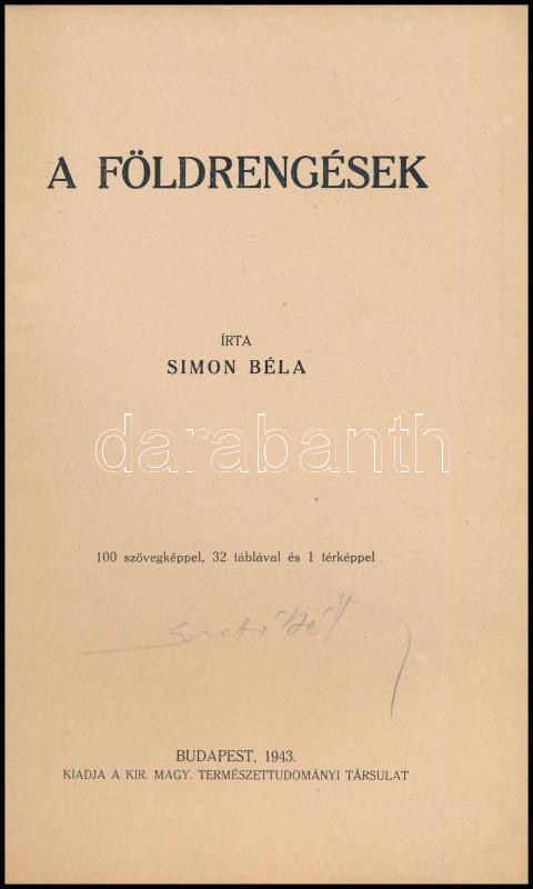 Simon Béla: A földrengések. Bp., 1943, K. M. Természettudományi Társulat, 1 (kihajtható térkép) t. + 183 p. + XXXII (fekete-fehér képek) t. Szövegközi és egészoldalas képekkel illusztrálva. Kiadói papírkötés.