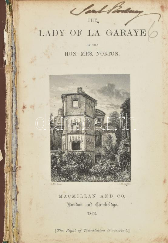 [Caroline Norton (1808-1877)] Hn. Mrs. Norton: The Lady of La Garaye by the - -. London - Cambridge, 1863., Macmillan and Co., I-XIII+1+1+16-153+5 p. Korabeli aranyozott egészvászon-kötés, aranyozott lapélekkel, kopott borítóval, laza, kissé sérült fűzéssel, laza lapokkal.