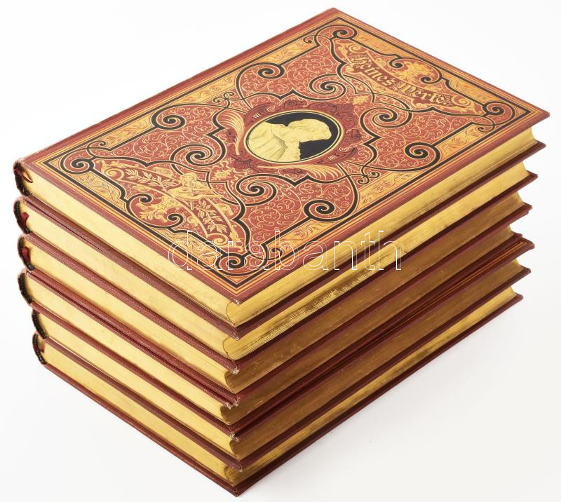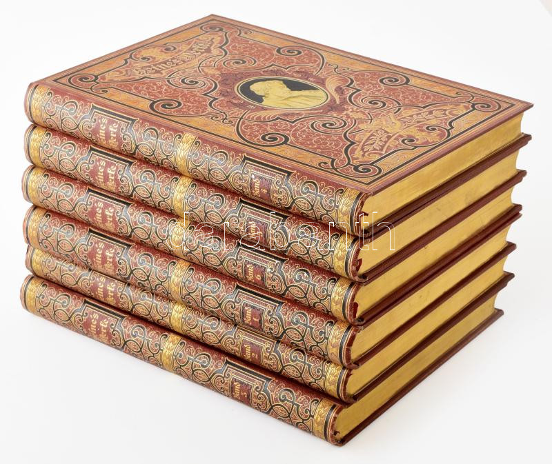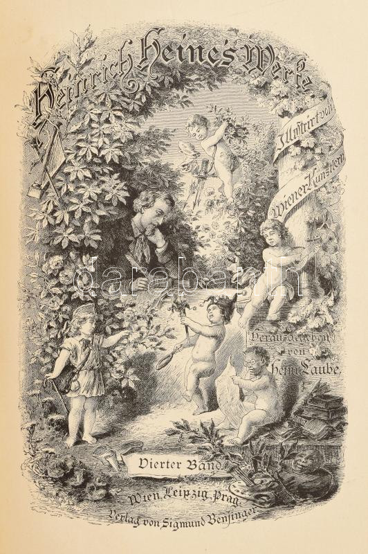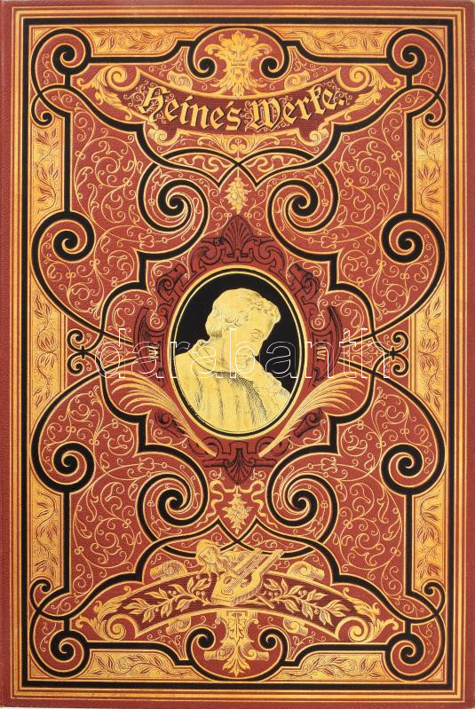 Heinrich Heine's Werke I-VI. köt. Hrs. von Heim Laube. Wien-Leipzig-Prag, é.n., Verlag von Sigmund Bensinger (druck: Ch. Reiger & M. Werthner, Wien), 8+378+1 p.; 4+384+1 p.;4+375+3 p.;4+376+4 p.;4+378+2 p.; 4+377+3 p. Német nyelven. Teljes sorozat! F. W. Bader fametszeteivel gazdagon illusztrált. Kiadói dúsan aranyozott, festett, illusztrált piros egészvászon díszkötés, Wien, Hermann Scheibe-kötés, aranyozott lapélekkel. Szép, igényes, gyűjtői állapotban!