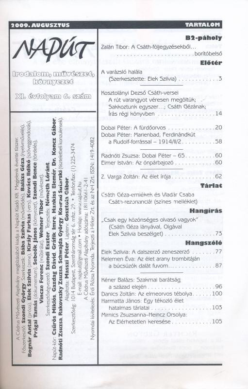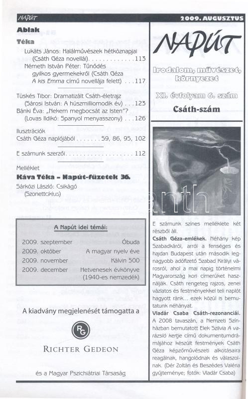 2009 Napút. XI: évf. 6. sz. 2009. augusztus. Csáth-szám, 128 p. + Sárk...