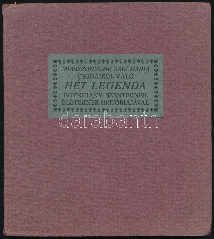 Description: Az Miasszonyunk Szíz Mária csodáiról való Hét Legenda mellyeket egynihány szenteknek életeknek rövid Históriájával egyetemben több régi magyar manuskriptumokból kiszedegetett Király György. Gyomán, 1942. Kner Izidor, 95+(1) p.+ 4 t. Kozma Lajos fametszeteivel és könyvdíszeivel illusztrálva. Kiadói papírkötés.