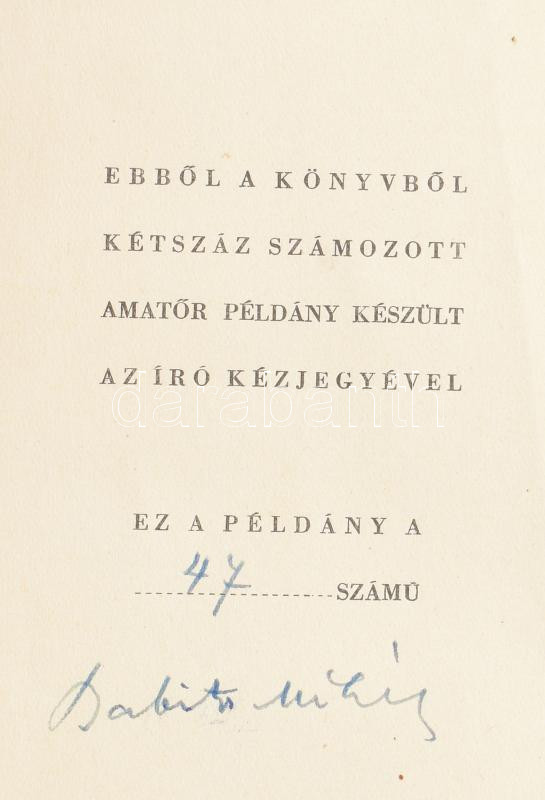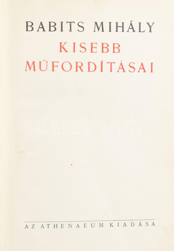 Babits Mihály kisebb műfordításai. Babits Mihály összegyűjtött munkái IX. [Bp.,1939],Athenaeum, 4+387 p. Kiadói félbőr-kötés, műanyag védőborítóban, kopott borítóban, szakadt elülső előzéklappal. "Ebből a könyvből kétszáz számozott amatőr példány készült az író kézjegyével." Számozott (47./200), a szerző, Babits Mihály (1883-1941) író, költő, szerkesztő által ALÁÍRT példány.