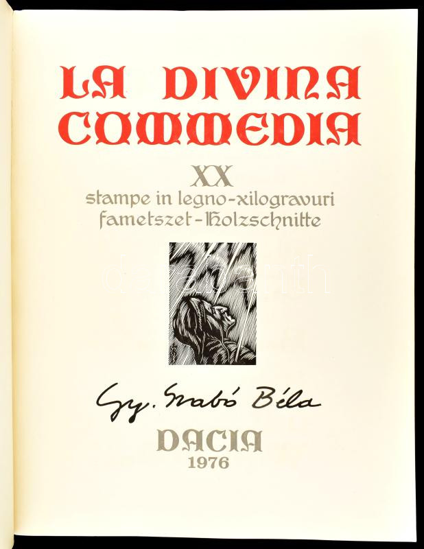 Dante Alighieri: La Divina Commedia. Kolozsvár, 1976, Dacia. Gy. Szabó... https://www.darabanth.com/en/454-Online-auction/454.0/Books/Books-Other-rarities~1500035/Dante-Alighieri-La-Divina-Commedia-Kolozsvar-1976-Dacia-Gy-Szabo-Bela-20-db-fametszetevel-~II2965984