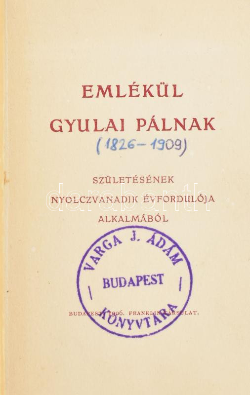 Emlékül Gyulai Pálnak - Születésének nyolczvanadik évfordulója alkalmából. (Versek). Bp., 1906, Franklin-Társulat, 43 p. + 5 t. Kiadói, kissé viseltes, foltos egészbÅ‘r-kötésben, kissé sérült lapszélekkel, tulajdonosi bélyegzÅ‘vel, ajándékozási bejegyzéssel, egy képtáblánál hiányzó hártyapapÃrral.