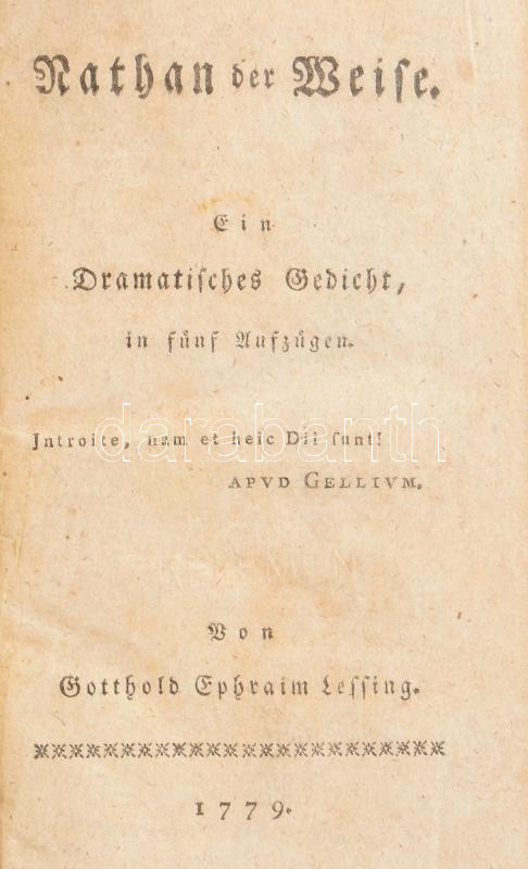 Gotthold Ephraim Lessings: Nathan der Weise. Ein dramatisches Gedicht. hn., 1779, nyn., 255 p. Német nyelven. Utánnyomás az első kiadásról, az első kiadás évéből. Korabeli kartonált papírkötés, kopott borítóval. Gotthold Ephraim Lessing (1729-1781) német drámaíró, kritikus, esztéta, dramaturg, a felvilágosodás egyik kiemelkedő alakjának utolsó, jelentős műve.