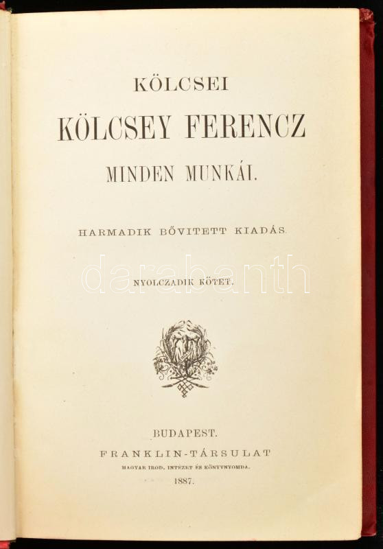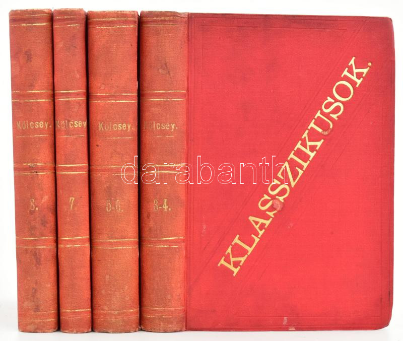 Kölcsei Kölcsey Ferencz minden munkái. 3-4., 5-6., 7., 8. köt. (4 kötetben). Bp., 1886-1887, Franklin-Társulat. Harmadik, bővített kiadás. Aranyozott egészvászon sorozatkötésben, festett lapélekkel, nagyrészt jó állapotban, a borítókon némi kopással, foltokkal.
