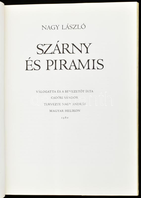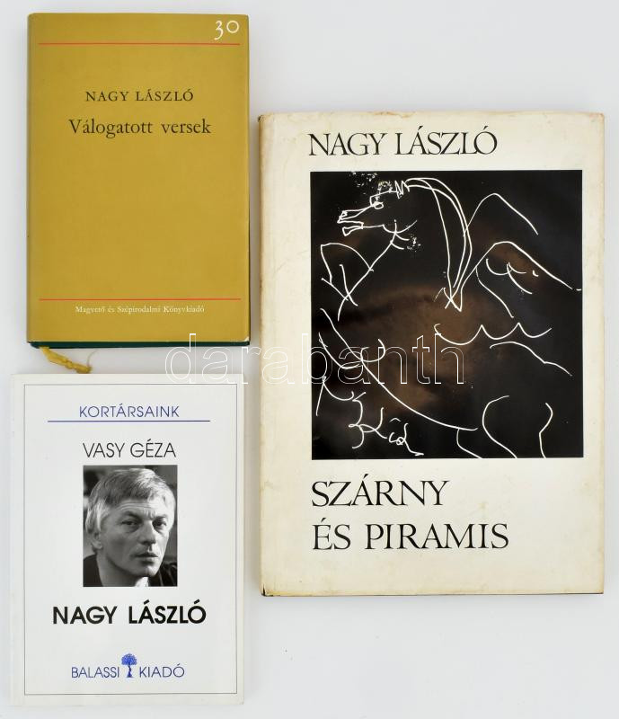 Nagy László 3 műve: Szárny és piramis. Képek és versek. Vál. és a bevezetőt írta Csoóri Sándor. Bp., 1980., Magyar Helikon. Kiadói egészvászon-kötés, kiadói papír védőborítóban.; Válogatott versek. 30 év. Bp.,1976,Magvető és Szépirodalmi. Kiadói egészvászon-kötés, kiadói papír védőborítóban.; + Vasy Géza: Nagy László. Kortársaink. Bp., 1995., Balassi. Kiadói papírkötés.