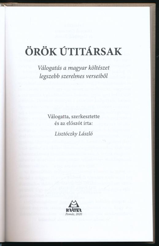 Description: Örök útitársak. Válogatás a magyar költészet legszebb szerelmes verseiből. Vál. szerk. és az előszót írta: Lisztóczky László. Pomáz, 2020, Kráter. Kiadói kartonált papírkötés.