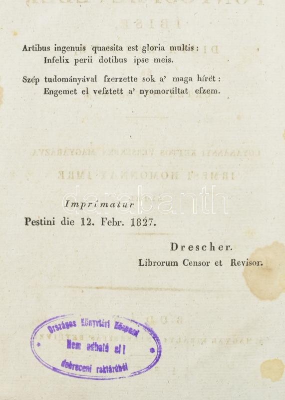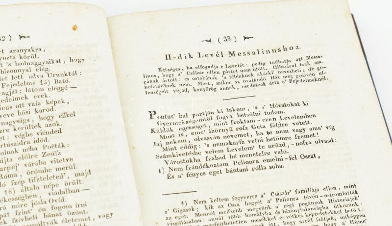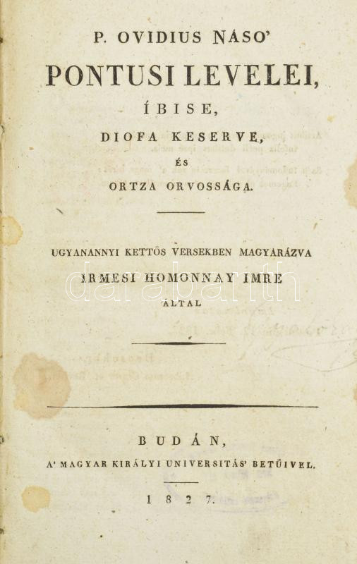 Ovidius Naso', P[ublius]: - - Pontusi levelei, Íbise, Diofa keserve, és Ortza orvossága. Ugyanannyi kettős versekben magyarázva: irmesi Homonnay Imre által. Budán, 1827. A' Magyar Királyi Universitás' betűivel. VIII, [4], 240, [18] p. Igényes modern félbőr kötésben