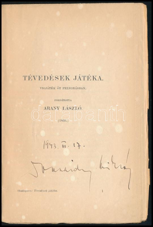Shakespeare, William: Tévedések játéka. Vígjáték öt felvonásban. Ford.... https://www.darabanth.com/en/454-Online-auction/454.0/Books/Books-Other-rarities~1500035/Shakespeare-William-Tevedesek-jateka-Vigjatek-ot-felvonasban-Ford-Arany-Laszlo-hn~II3030585