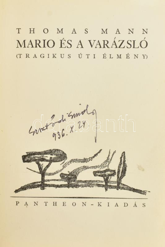 Thomas Mann: Mario és a varázsló. (Tragikus úti élmény). Ford.: Sárközi György. Hozzákötve: Rendetlenség és kora bánat. Ford.: Dormándi László. Bp., [1930], Pantheon (Hornyánszky-ny.), 143+(1) p., 125+(1) p. Lányi Imre könyvdíszeivel. Aranyozott egészbőr-kötésben, javított gerinccel, helyenként apró lapszéli foltokkal és sérülésekkel.