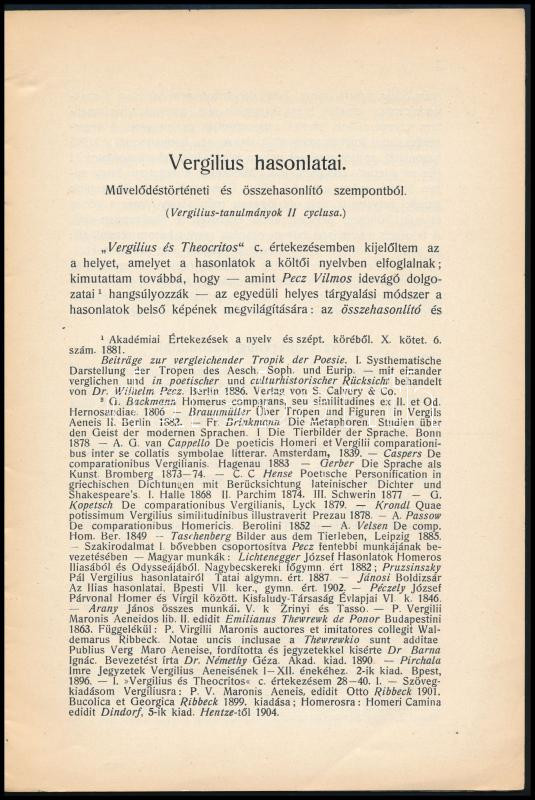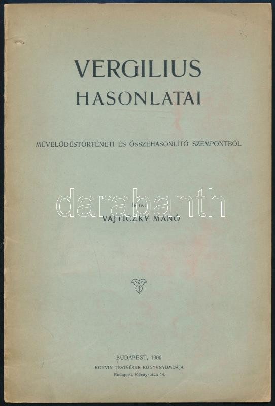 Vajticzky Manó: Vergilius hasonlatai művelődéstörténeti és összehasonlító szempontból. Bp., 1906, Korvin Testvérek-ny., 17+(1) p. Első kiadás. Kiadói tűzött papírkötés.