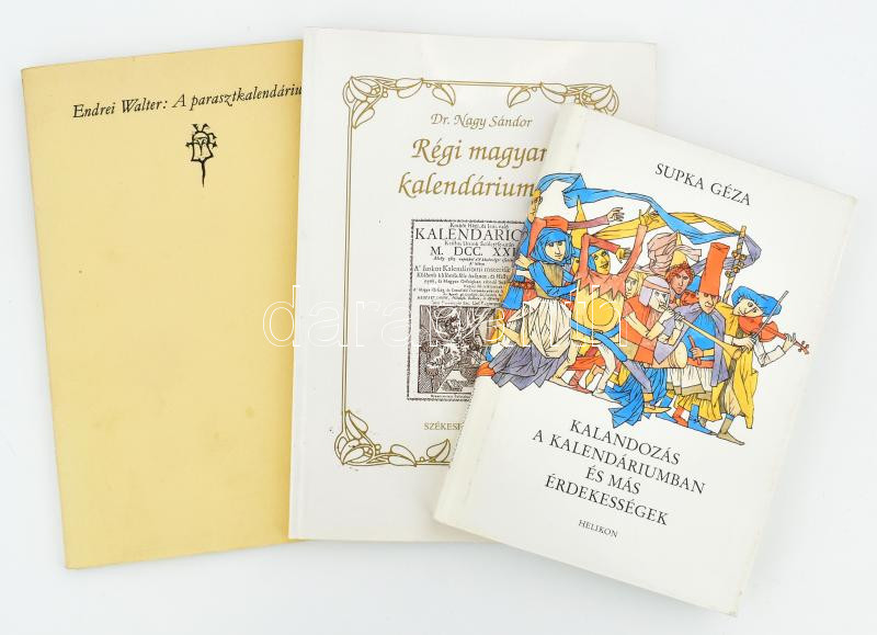 Vegyes kalendáriummal kapcsolatos tétel, 3 db: Nagy Sándor: Régi magyar kalendárium. Székesfehér, 1995., (Mátrix Kft-ny.) Kiadói papírkötés.; Supka Géza: Kalandozás a kalendáriumban és más érdekességek. Rékassy Csaba illusztrációival. Bp.,1989,Helikon. Kiadói egészvászon-kötés, kiadói papír védőborítóban.; Endrei Walter: A parasztkalendárium. Bp., 1983, Magyar Iparművészeti Főiskola, 42+1 p.+1 melléklet. Szövegközti illusztrációkkal. Kiadói papírkötés.;